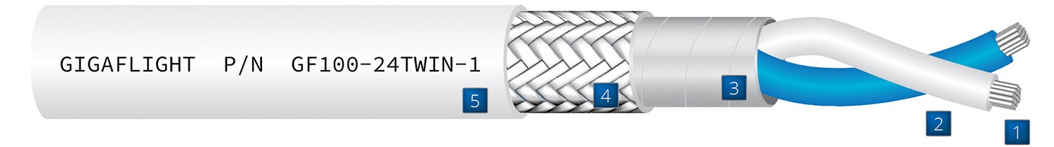 GF100-24TWIN-1; RS422, RS485, NTSC/PAL ve RS170 veri ve video uygulamalarında kullanılan, havacılık sınıfı 100 ohm bükümlü çift bir kablodur. Buna ek olarak bu kablo, ARINC 664'te belirtildiği üzere 10/100 Base-T uygulamalarını karşılamak üzere tasarlanmıştır. %100 folyo ve %95 yuvarlak tel örgü ekrandan oluşan çift ekranlı yapı, havacılık uygulamalarının büyük çoğunluğu için gerekli ekranlama etkinliğini sağlar.